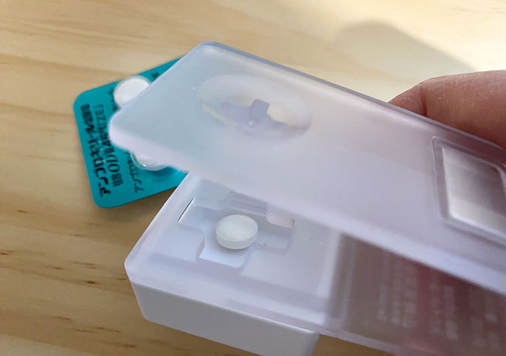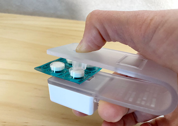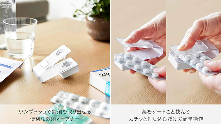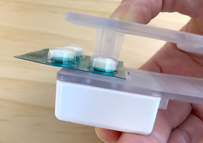 ホッチキスのようになっていて、薬をシートごと挟んだら、指でカチッと押し込むだけで簡単に錠剤を取り出せるアイテムなんです。