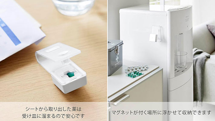 また、マグネットが内蔵されているため、冷蔵庫や洗面所、ウォーターサーバー横など、いつも薬を飲む場所に取りつけておけば、必要な時にさっと手に取れますよ。