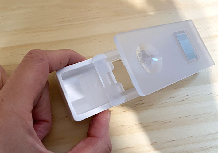 受け皿をスライドすると簡単に分離し、溜まった薬が指でさっと取り出しやすくなっています。