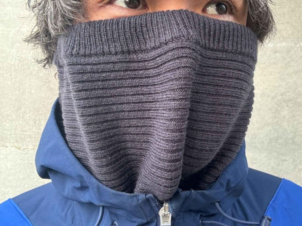 本来の被り方とは異なりますが、工夫次第で使い方を変えられるのも『首のチクチクを抑えたメリノウール混 バラクラバ』のポイントかもしれません。