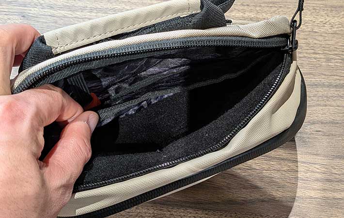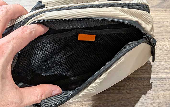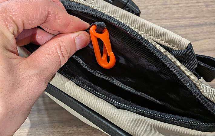 メインコンパートメントは、大きめの仕切りが1つと、キークリップが付属。鍵などの貴重品を入れるのに役立つでしょう。