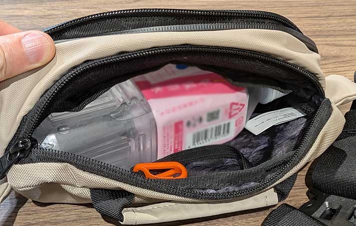 セオンウエストパックは、容量2Lの小さなウエストバッグ。手に持つとそのコンパクトさが際立ちます。