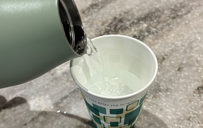 飲み口のギリギリいっぱいまでお湯を注ぎ、待つこと4時間。紙コップにお湯を注いでみました。
