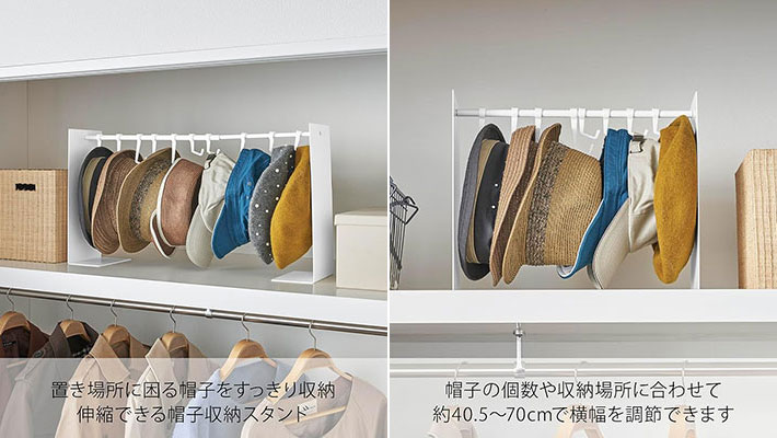 帽子の個数や置き場所に合わせて幅のサイズを40.5cm~70cmと変えられるので、スペースを無駄づかいせず、ぴったり収まります。