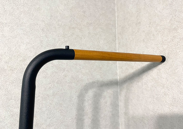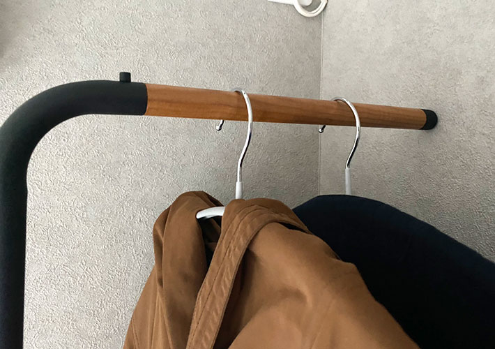 ハンガーを掛けるバーの部分は天然木が使われていて、さっと無造作に置いておくだけで木目がアクセントになり上品なんですよね。