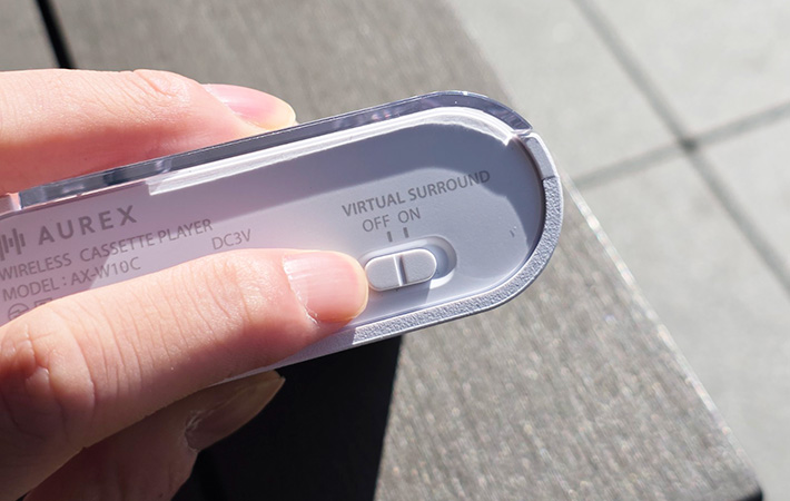 本体側面にはスイッチがあり、スライドさせると左右の音のバランスを調整して臨場感を高める『バーチャルサラウンド』機能を有効にできます。