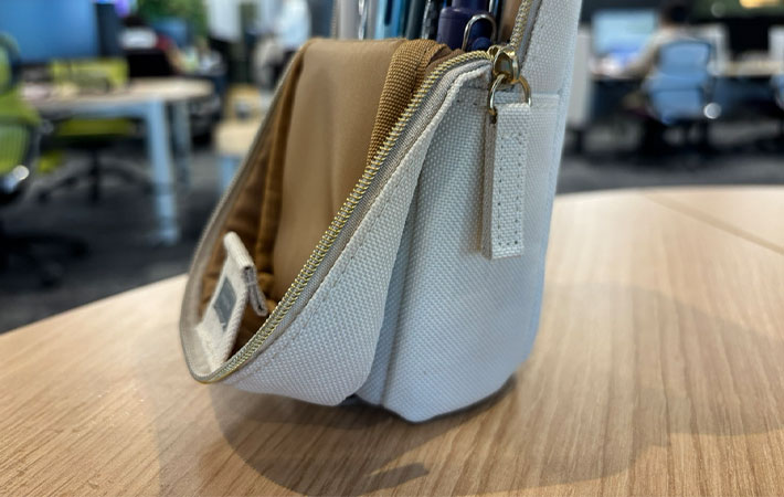 キャンバス素材で作られた本体にはダブルファスナーがついていて、ガバッと開く構造になっています。