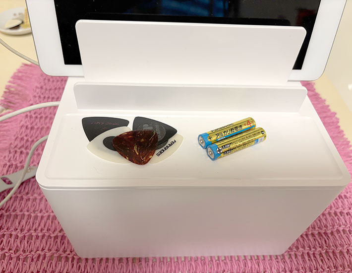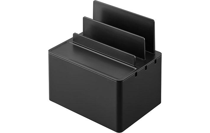 ボックスの蓋部分には、高さの異なるスタンドが設けられており、スマホやタブレットを立てかけて収納可能。