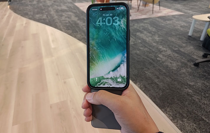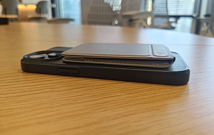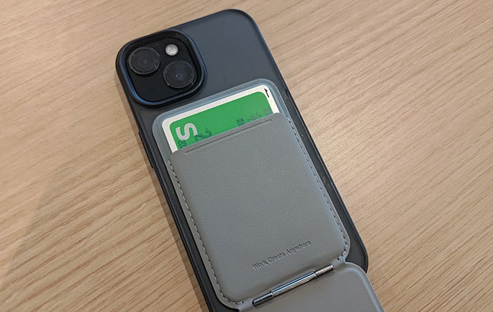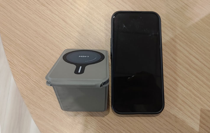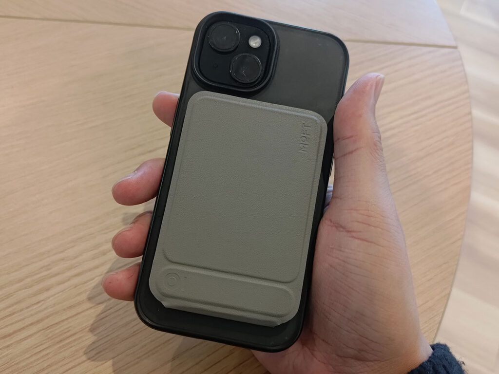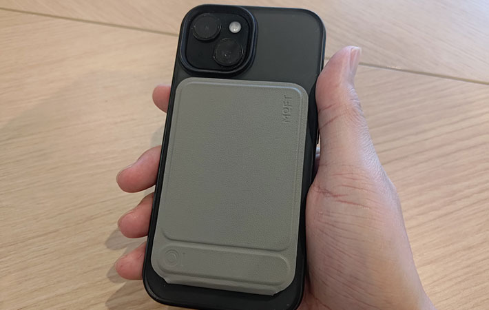 iPhoneの場合、MagSafeに対応していればそのままピタッと貼りつきます。なお、ケース越しでも問題ありません。
