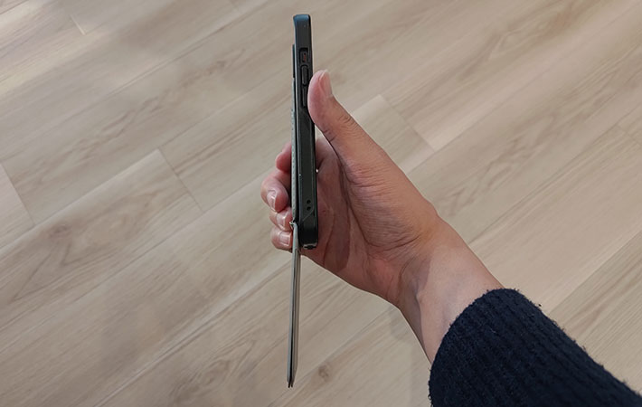 『MOFT 8-in-1 多機能スタンド』は磁力がかなり強く、スタンドを一部たたんで自撮り棒のように持つことも可能です。