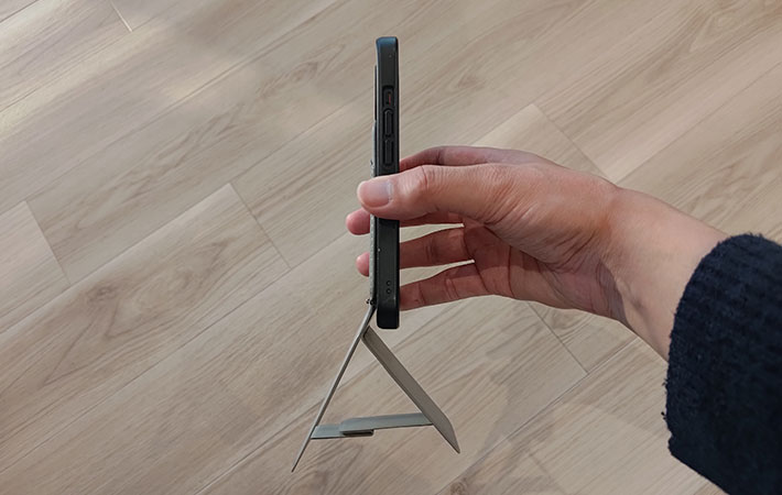スタンドを立てて置くことで、視線や頭をあまり下げることなく、片手でiPhoneを操作できるため、思っていたよりも楽に感じられました。