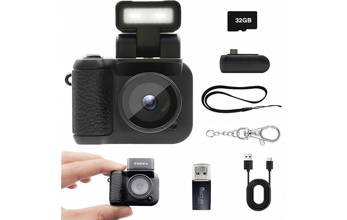 SRVR デジタルトイカメラ ミニカメラ ミニカメラ ミニデジタルカメラ 1080P 1.44インチ画面 充電ベース付き 25g重さニ 32GBカード付属 修学旅行 学生 初心者 TYPE-C充電式 日本語取扱説明書 (1, 輝黒(きこく))