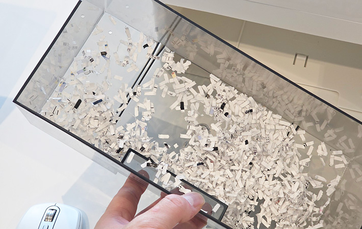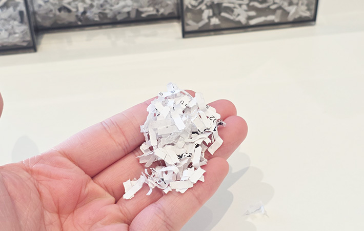 実際にA4用紙を2枚まとめて細断してみたところ、数秒で処理が完了。書類が多少たまっていても、テンポよく片付けられました。