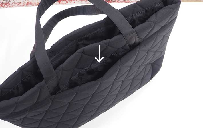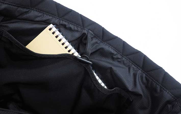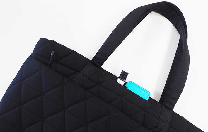 キルティング生地でクッション性があり、ノートPCやガジェット類を入れる時も安心感があります。