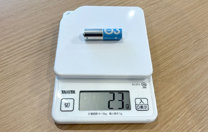 計測してみたところ、一般的な単3乾電池が23gだったのに対し、『batzone リチウムイオン充電池 単3』は16gでした。