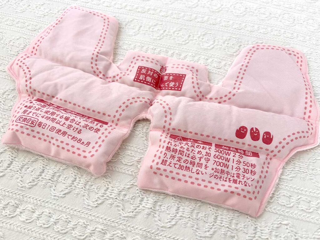 500Wなら2分、600Wなら1分50秒加熱したら、文字が書いてある面を上にして、肩に載せるだけ。