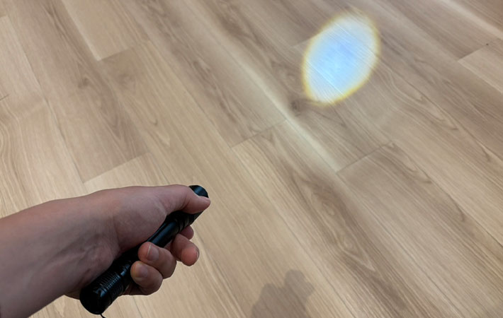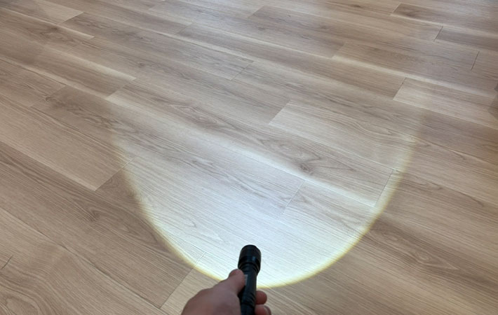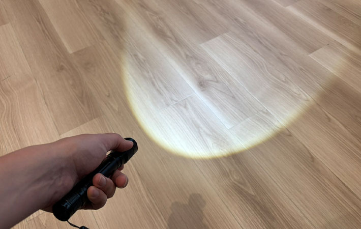 この環境なら『LEDハンディライト ズーム機能付き』を検証するのにピッタリでしょう。早速ライトをつけました。