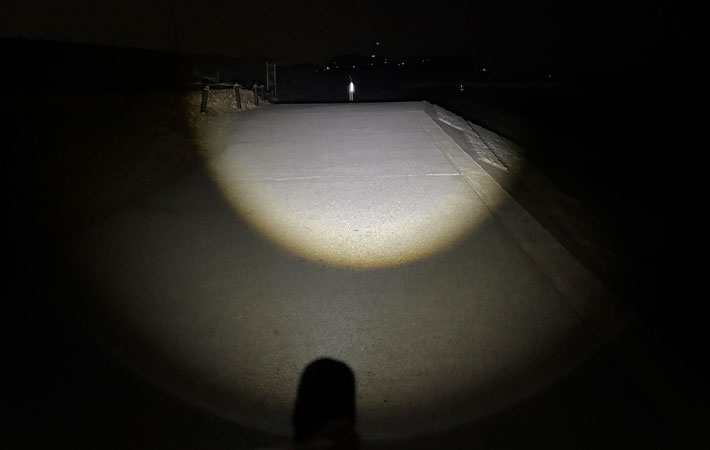 この時はライトの範囲を最大に広げて照らしましたが、スポットに絞ると最大110mもの長距離を照らすことができるといいます。