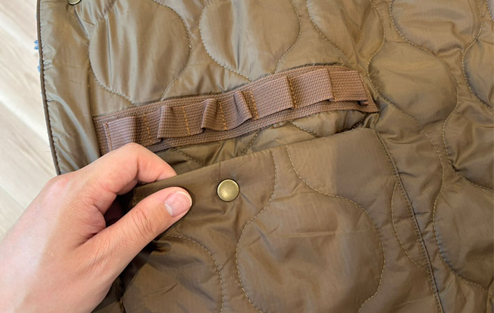 キルティング生地の表面には、ポケットとカラビナループがついています。