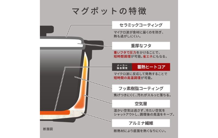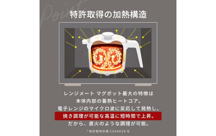 一方、『レンジメート マグポット』は、本体内部の特殊発熱体(蓄熱ヒートコア)が加熱され、その熱が食材に伝わり直火調理に近い仕上がりを実現する構造になっています。