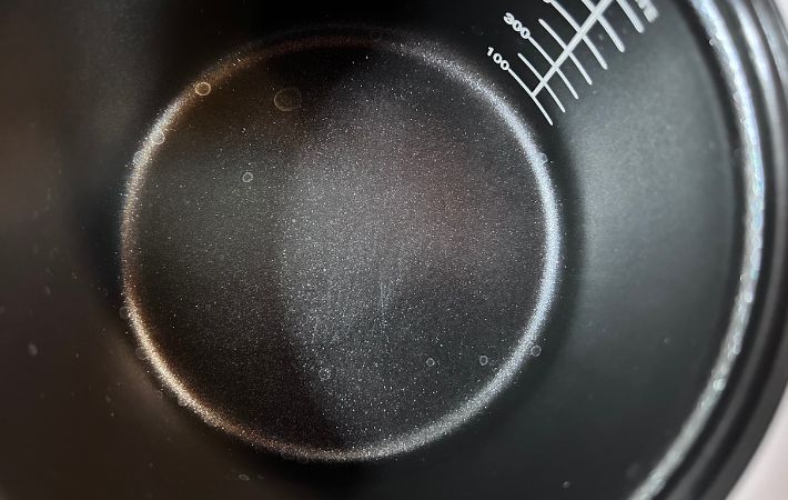 本体の内部は耐スクラッチ性が高く、フッ素樹脂コーティングが施されているので、焦げつきにくく汚れも落としやすい仕様になっています。