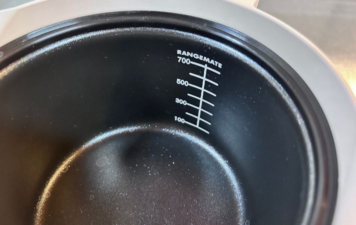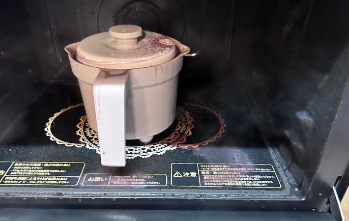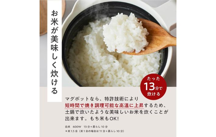 浸水後のお米と、300㎖よりやや多めの水をマグポットに入れ、600Wで13分加熱。その後、蓋をしたまま10分蒸らします。