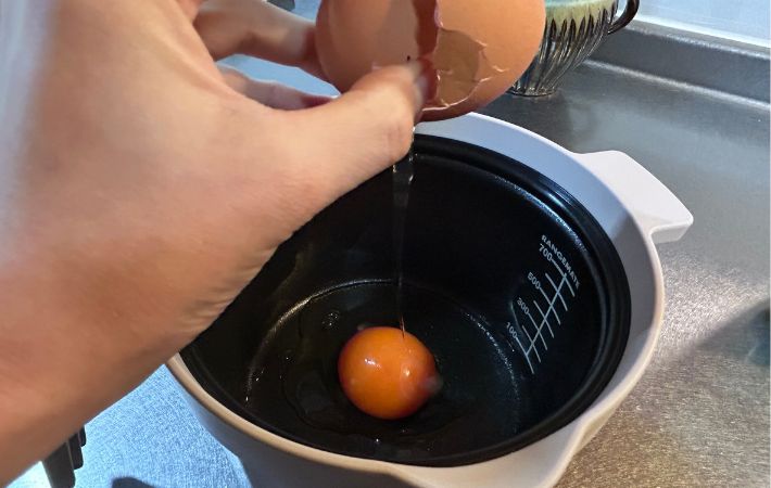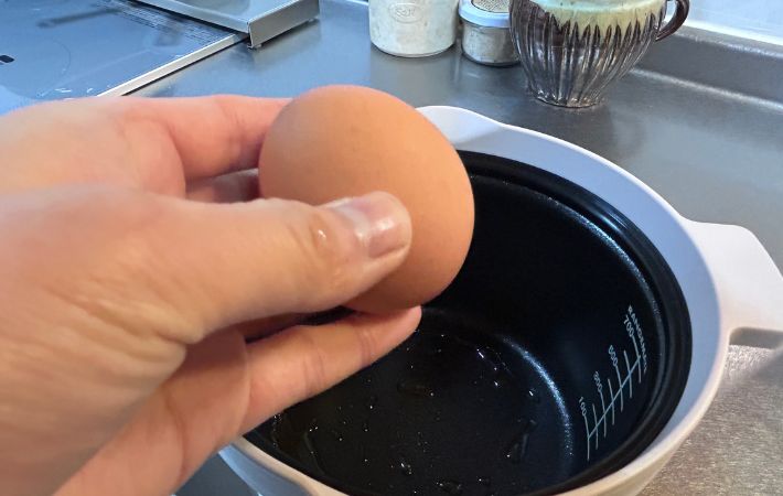 まずはマグポットの底に油を薄く敷き、卵を割り入れて蓋をします。