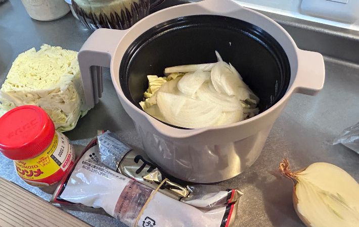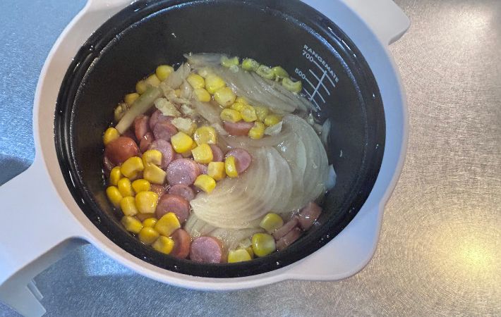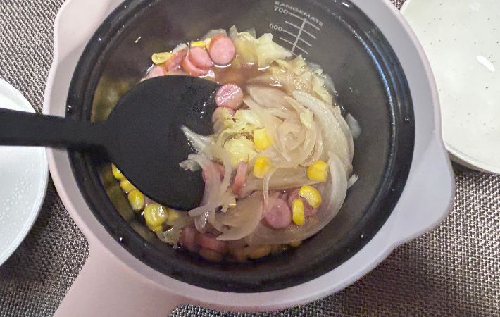 玉ねぎやキャベツはしっかり火が通り、ウインナーもぷりっとした仕上がり。電子レンジ調理とは思えないほど、具材全体が均一に温まっていました。