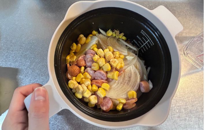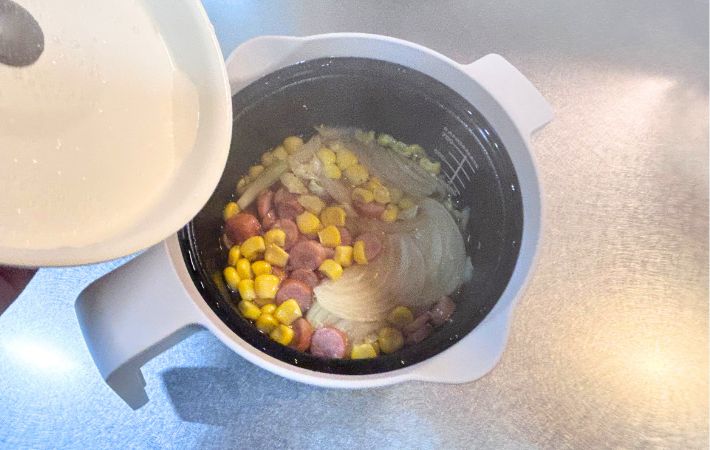 材料を食べやすい大きさにカットしたら、調味料、水と一緒にまとめてマグポットの中へ。