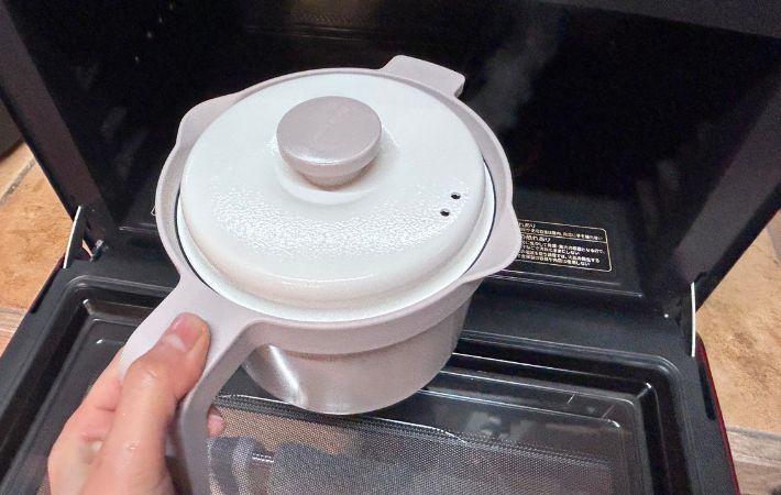 食材を入れて蓋をし、後は電子レンジで決まった時間加熱するだけ。
