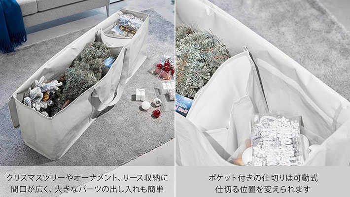 クリスマスツリーやオーナメントをまとめて収納できる大容量バッグで、可動式のポケットつき仕切りで細々したものも整理しながらしまえるという優れもの。
