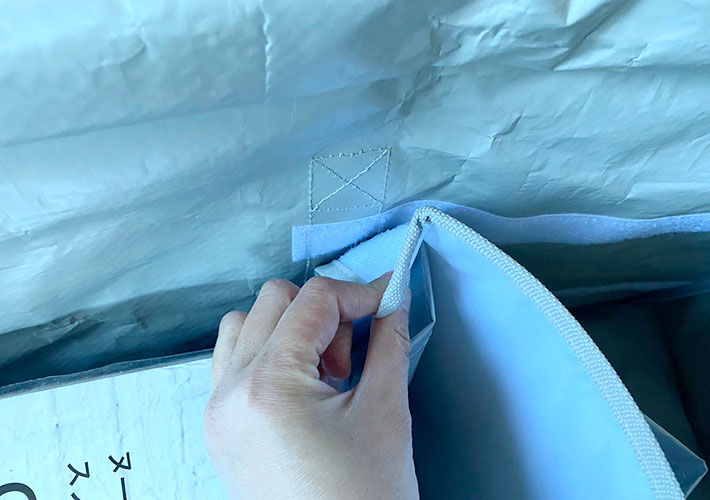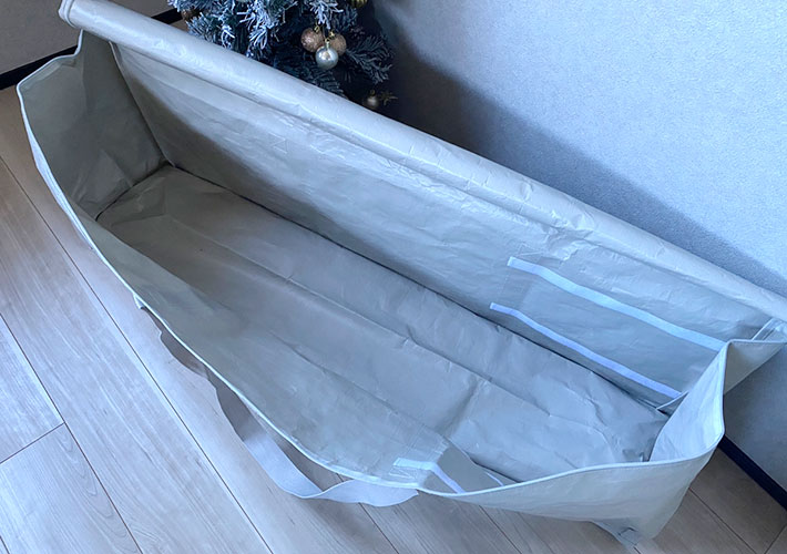 ぐるっと一周してファスナーが開き、ガバッと間口が広いので出し入れがしやすい!大ぶりなツリーでもストレスなく片づけられそうです。