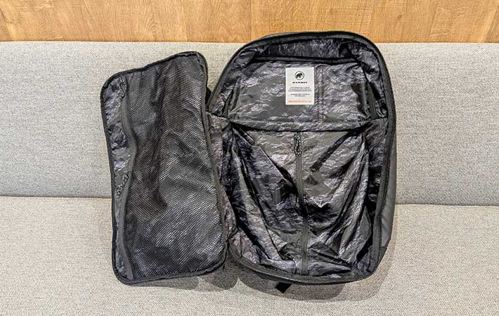 大きく開くメインコンパートメントは、大きな荷物の出し入れもしやすく、見た目以上にものが入ります。