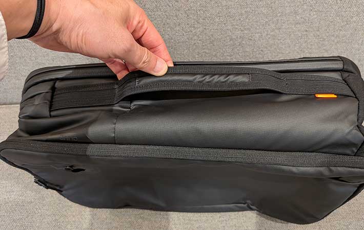 サイドのベルトを使って、ビジネスバッグのように持つとこのような感じです。