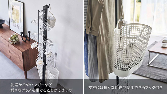 さらに、引っ掛けて収納できる2段のハンガー専用スペースまで備わっていて、このスタンド1つで洗濯周りのアイテムがすっきりまとまります。