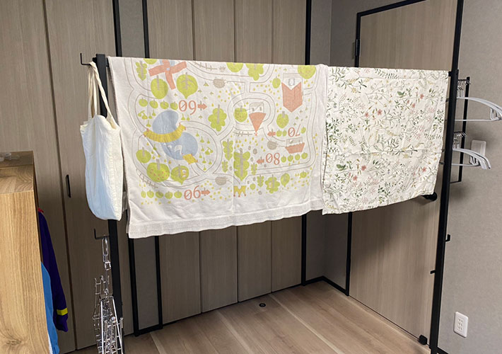 子供のおねしょで急きょシーツやブランケットを乾かしたい時も、ワイドでゆったり干せるのでかなり重宝しています!