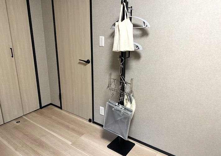 ・コンパクトに畳める上に、ハンガーや洗濯バサミなどを引っ掛けておけるのがとても便利。