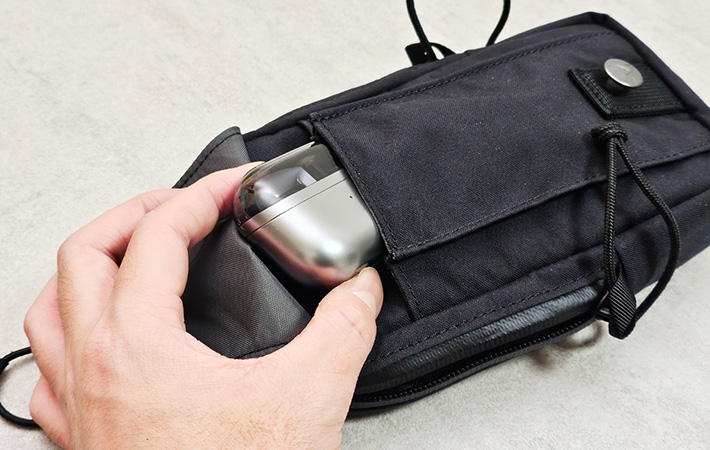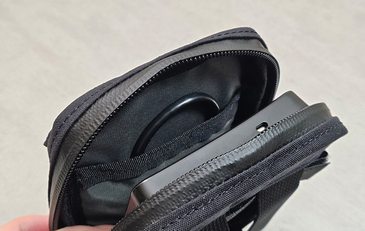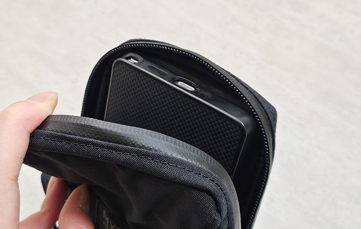 筆者は6.9インチの大型スマホに厚みのあるケースを装着していますが、ちょうどピッタリ収まるくらいのサイズ感でした。
