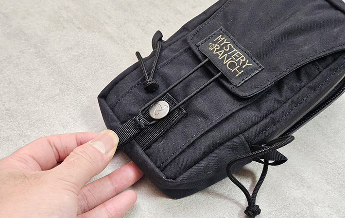 開閉はファスナーではなくコードをボタンに引っ掛ける仕様。ワンアクションでサッとアクセスできるため素早く出し入れできますよ。