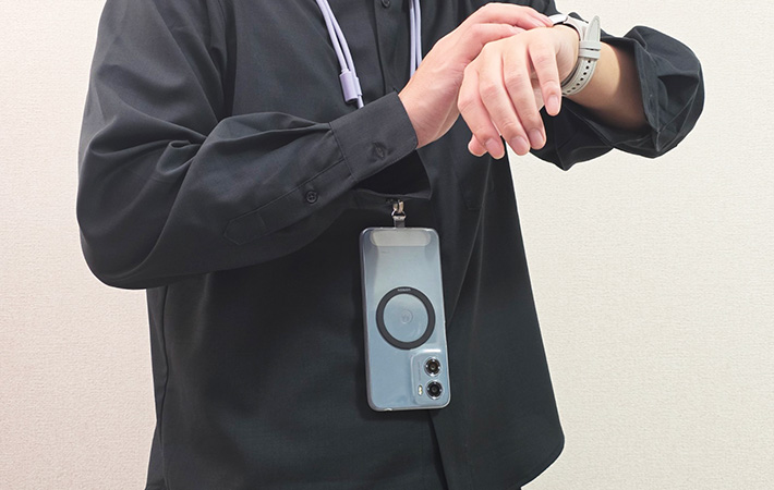 ストラップの長さが十分にあり、ショルダーバッグのように掛けて使えるため、スマホをスムーズに手に取れます。