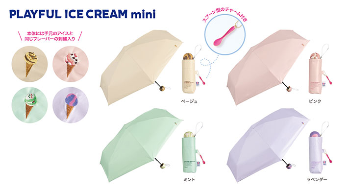 傘部分にプリントしたフレーバーが生地色とリンクした『サーティワン アイスクリーム×Wpc. 遮光アイスクリームパターンミニ』は3色展開。