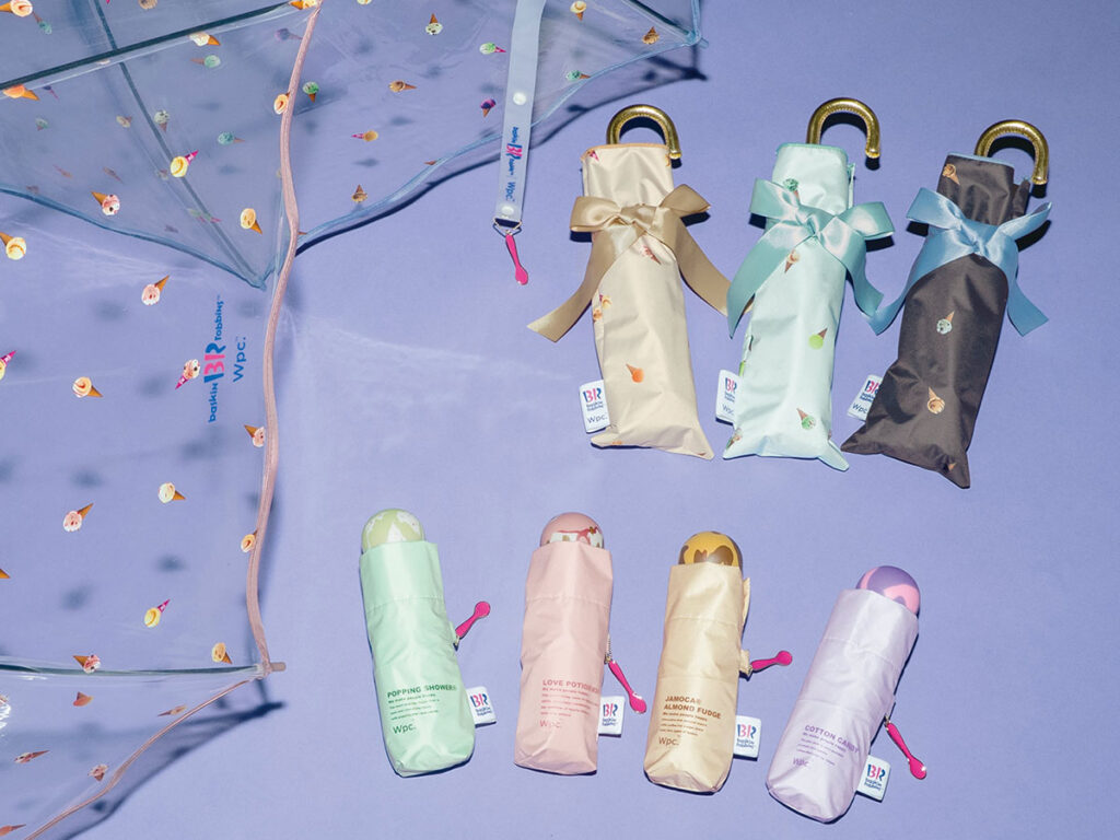 傘ブランド『Wpc.』(ダブリュピーシー)は、アイスクリーム専門店『サーティワン アイスクリーム』との初のコラボ傘を発売。ラインアップは、折りたたみ日傘7種類とビニール傘2種類の全9種類です。
