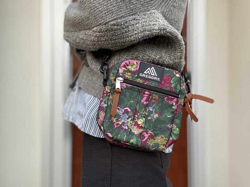 「かわいいけど、おしゃれ上級者じゃないと厳しいか…」と諦めていたグレゴリーの花柄ミニショルダー 思い切って挑戦したら「かわいすぎ!」「めちゃ上品」 ファッション By - クミペイ 更新:2026-02-27 ※本記事はUPDATEが独自に制作したコンテンツです。また、本記事を経由して商品の購入が発生した場合に、ECサイト等から送客手数料を受領することがあります。 アメリカ生まれのバックパックブランド『GREGORY(以下、グレゴリー)』。 ブランドを代表する『デイパック』は、アウトドア愛好家からだけでなく、通勤通学などのタウンユースでも使えるファッションアイテムとして、幅広く支持されています。 そんな『グレゴリー』の中で、筆者がかねてより気になっていたのが『ガーデンタペストリー』という花柄の存在。 ほとんどのバッグの定番カラーの中に『ガーデンタペストリー』が存在するのです。 ※写真のモデルは『ファインデイ V2』 これ、めっちゃかわいくないですか? 見るたびに惹かれてしまう不思議な魅力があるのですが、なかなかに冒険色。 洋服もつい無難なカラーばかりを選んでしまう筆者にとってはハードルが高く、ずっと手を出せずにいました。 しかし、「バッグぐらい冒険してもいいのでは?」と思い立ち、ついに『ガーデンタペストリー』のアイテムを購入するに至ったのです。 ついにグレゴリーの花柄アイテムを手に入れた! 筆者が購入した『ガーデンタペストリー』のアイテムは、『デイパック』ではなく『クイックポケットM』。 Amazonで見る 楽天市場で見る やはり、いきなり面積が大きいリュックはハードルが高すぎたので、まずは小さめのショルダーバッグを選んだ次第です…。 そんな少しばかり消極的な理由で選んだ『クイックポケットM』でしたが、実際に手に取ってみると、派手だと思っていた印象がガラッと変わりました! しかも、ちょっとそこまでお出かけするのにとても便利だったので、詳しく紹介します。 上品で落ち着いた雰囲気の花柄 グレゴリーの『ガーデンタペストリー』は、壁掛けなどに使用される室内装飾用の織物『タペストリー』の風合いをプリントで表現したもの。 花柄でありながらも落ち着いた印象で、思っていたよりもずっと上品な雰囲気です! これならどんなファッションに合わせても悪目立ちせず、コーデのアクセントにもなってくれそうです。 『クイックポケットM』のスペックは? 『クイックポケットM』は、縦19cmx横14.5cmxマチ5.5cmと、かなりコンパクトなショルダーバッグ。 手に持った瞬間、その軽さにビックリ!重さはわずか155gで、卵3つぶんほどの重さです。 容量は約2Lと、スマホや財布、鍵などの貴重品を入れるのにちょうどよいサイズ感。 ちょっとそこまでのお出かけやサブバッグとしても使い勝手がよさそうです。 メインコンパートメントとポケットの開閉には、丈夫なYKKジッパーを採用。 グレゴリーのアイコンでもあるレザーのジッパープルがついているため、開閉がスムーズです。 メインコンパートメントのジッパーは両開きで、口が大きく開きます。 内ポケットはないため、小物類は前面のポケットに入れるのがよさそうです。 このポケット、高さ的にスマホは無理かなと思ったのですが… 実はジッパーの上にもスペースがあるため、大きめのスマホも入れられます。 また、ボックスプリーツが入っているので、多少厚みのある物でも収納することができますよ。 ショルダーストラップには、長さ調節をするための金具が両サイドに2個ついています。 両サイドに金具があることで、どちらの肩に掛けていても簡単に長さを調節することができるので便利です。 ショルダーストラップの取り外しも簡単。 背面には、スナップボタンがついた横向きのベルトが2本あるため、お手持ちのリュックやトートバッグなどのショルダーに取りつけることもできます。 スマホや財布を取り出す時に、いちいちリュックをおろす必要がなくなりますよ。 ただし、リュックのショルダーが太すぎると取りつけることができないので、購入の際は注意してください。 ワンマイルもツーマイルも行ける収納力! 筆者がワンマイルのお出かけの時に最低限持ち歩きたい荷物は以下の通り。 ・スマホ ・小銭入れ ・ハンカチ ・自転車の鍵 ・ワイヤレスイヤホン これらを、実際に『クイックポケットM』に入れてみると、余裕で入りました! あまりにも余裕があるので、入ってくれたら嬉しい容量350mLの水筒を追加してみると…。 わ~い、入った! 少し厚みは出るものの、しっかりジッパーも閉められます。 結果、この小さなバッグに以下の荷物を収納することができました。 ・スマホ ・小銭入れ ・ハンカチ ・自転車の鍵 ・ワイヤレスイヤホン ・容量350mLの水筒 これだけ入れば、ワンマイルと言わず、ツーマイルのお出かけにも対応できるでしょう! ちなみに、小銭入れはグレゴリーの『コインワレット』を使用。 Amazonで見る 楽天市場で見る 最近はキャッシュ