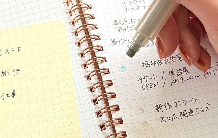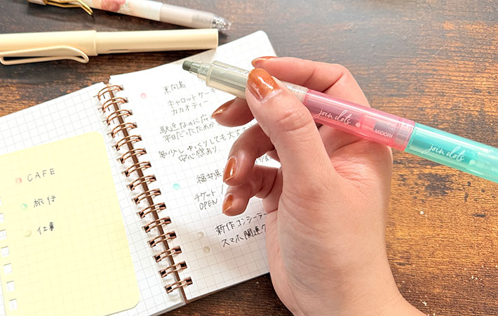 パステルカラーほど甘くなく、かといって地味すぎない色味で、ノート全体の雰囲気を壊さずに情報を整理できます。