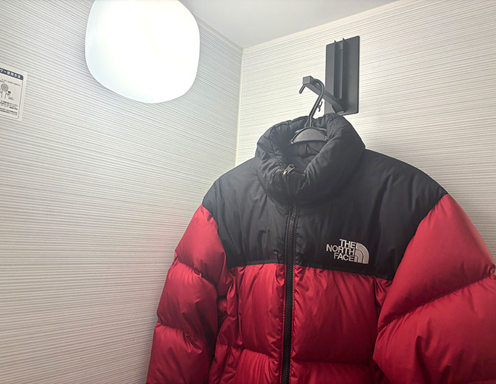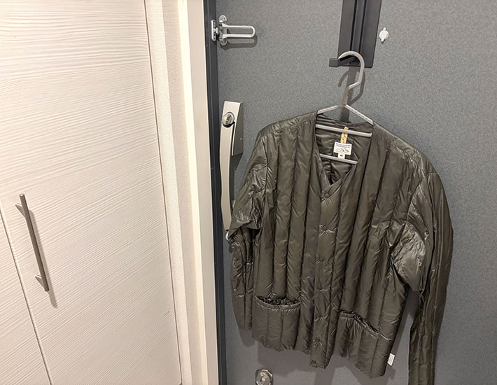 ちなみに選んだのは前ボタン式のダウンジャケット。ボタンを1つ留めるだけで、ハンガーから落ちにくくなります。
