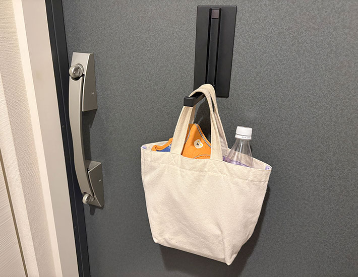 玄関ドアに取りつけるだけで、外出時に必要なものをすぐ手に取れるようになった『マグネット 折り畳みハンガー』。