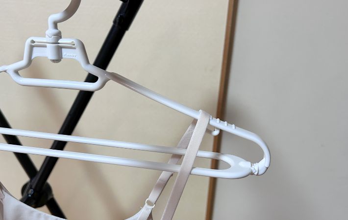 アーム部分には肩ひもフックがついており、キャミソールやブラジャーなどの細いストラップの衣類も干しやすい設計になっています。