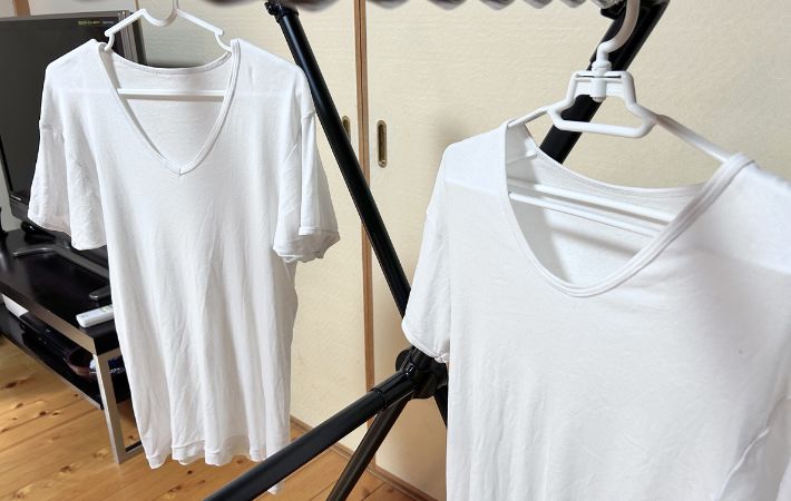 数時間後に触ってみると、通常ハンガーのほうは脇や背中部分にやや湿り気が残っているのに対し、フランドリーは内側まで比較的さらっとした感触。