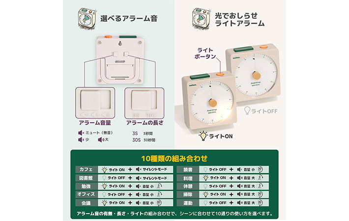 静かな環境で使う場合はアラーム音をオフにして、終了時の光の点滅だけで知らせる設定にもできます。