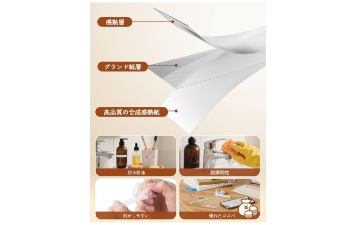 また、『感熱印刷』と『熱転写』の両方に対応しているのも特徴で、色あせしにくく、屋外での使用や長期間保存したい場合に向いています。